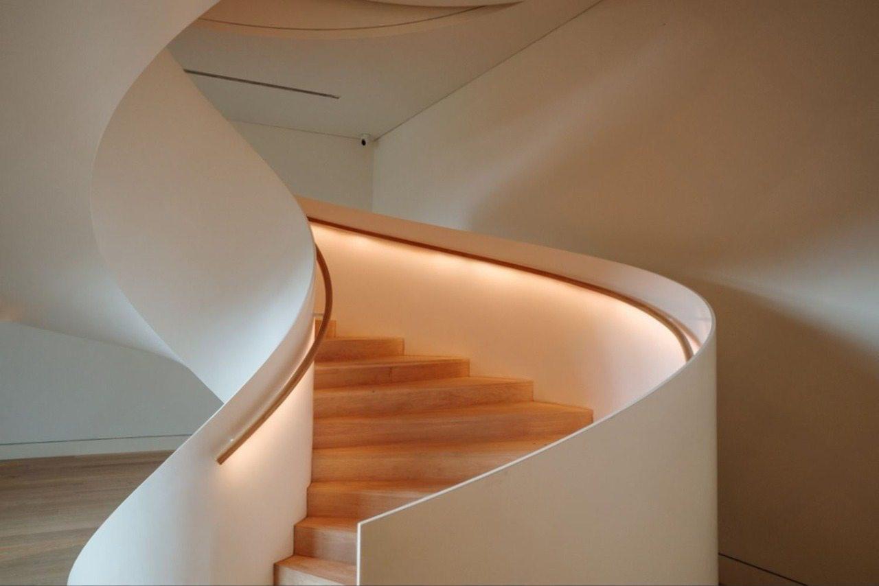 Идея для вашей лестницы: Стена, вдоль которой идет такая лаконичная лестница, может стать отличным фоном для декора. Отсутствие перил не будет мешать обзору, и большое абстрактное полотно или серия фотографий будут смотреться особенно выигрышно, не создавая визуального шума.
